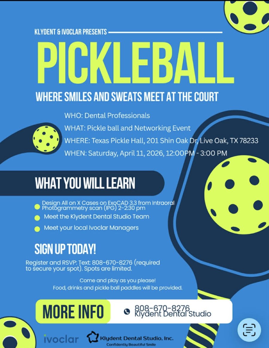 Join Klydent & Ivoclar for a unique event “where smiles and sweats meet at the court”. Beyond playing pickleball, you will learn to design “All on X” cases on ExoCAD 3.3 from intraoral photogrammetry scans and meet the local Ivoclar and Klydent teams.